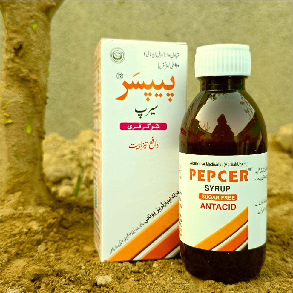 Pepcer Syrup is a DRAP-Approved herbal supplement formulated with botanicals traditionally used in Unani medicine to support gastric wellness and relieve symptoms of peptic ulcers. Its principal ingredient, Glycyrrhiza glabra (Licorice), is complemented by Valeriana officinalis, Hyoscyamus niger, and Emblica officinalis.